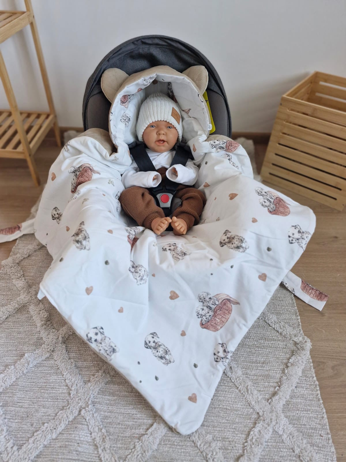 Mit einem TOG-Wert von 3 sorgt die Decke für zuverlässige Wärmeisolierung. Dank der Maße von 90x90 cm passt sie perfekt in jede Babyschale und lässt sich ebenso vielseitig im Kinderwagen oder zu Hause nutzen.