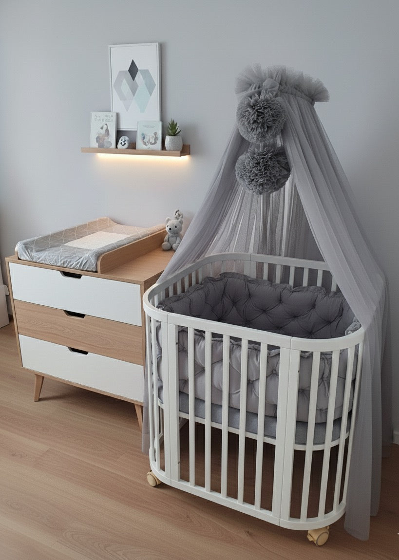 Verleihen Sie dem Schlafplatz Ihres kleinen Wunders einen Hauch von Luxus und Stil mit unserer samtigen Bettumrandung mit Rüschen. Diese exquisite Umrandung kombiniert hochwertige Materialien mit einem verspielten Design und schafft so eine einladende und gemütliche Atmosphäre im Kinderzimmer.