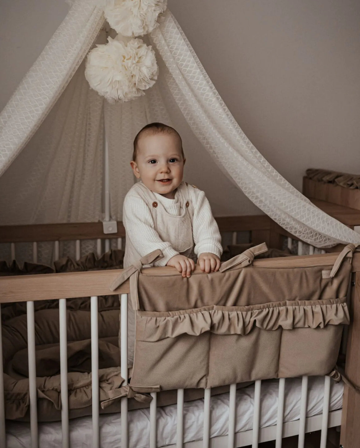 Bereichern Sie das Kinderzimmer mit unserem samtigen Bettorganizer mit Rüschen – eine stilvolle und praktische Lösung, um Ordnung zu halten und gleichzeitig eine luxuriöse Atmosphäre zu schaffen.