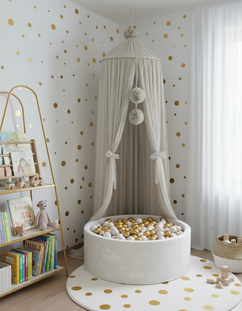Verwandeln Sie das Kinderzimmer in eine märchenhafte Oase mit unserem Baldachin aus Tüll und verspielten Pompoms. Dieser handgefertigte Himmel schafft nicht nur eine gemütliche Schlafumgebung, sondern setzt auch einen zauberhaften Akzent im Kinderzimmer.