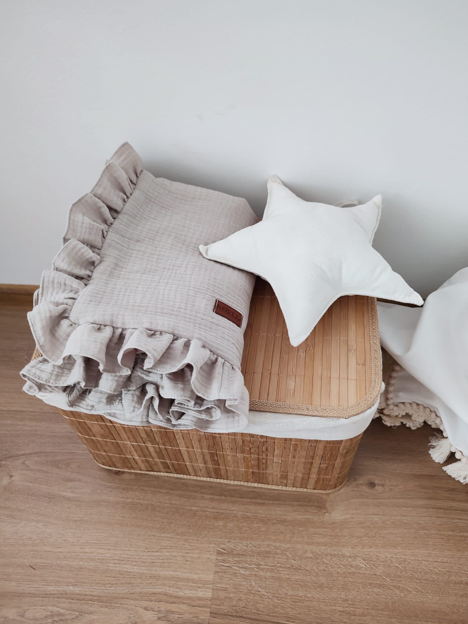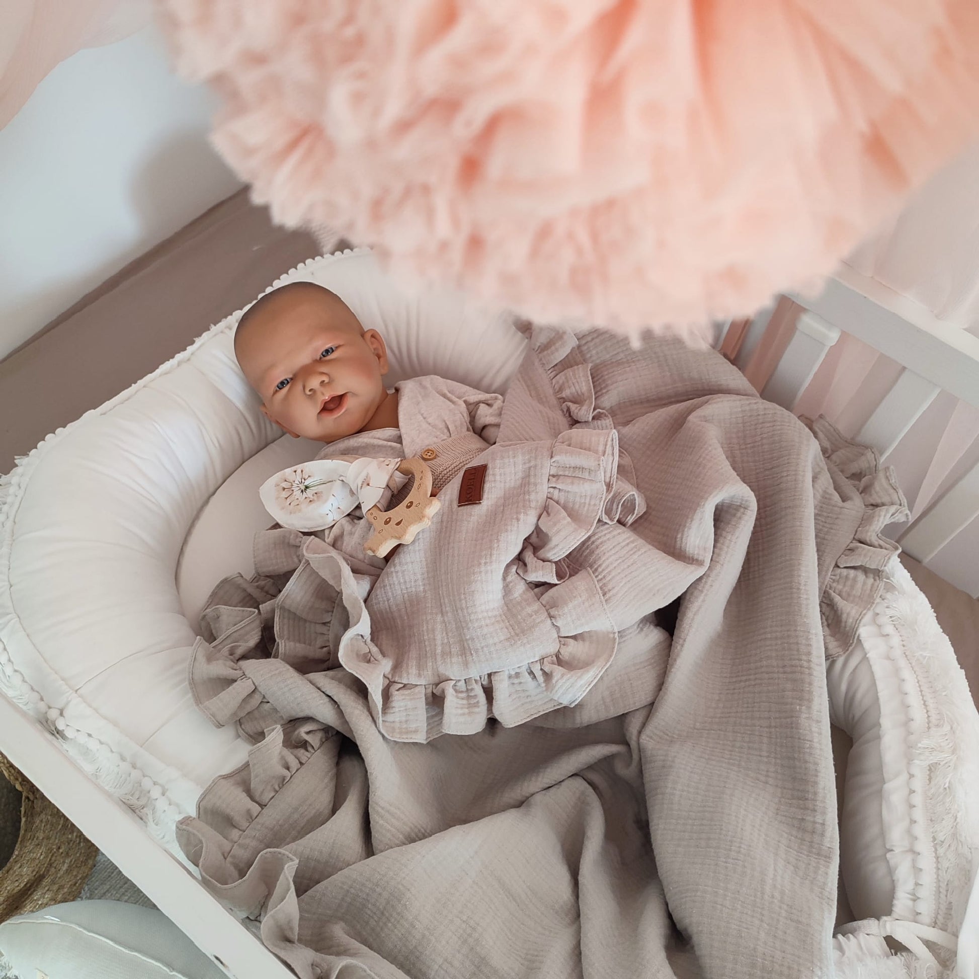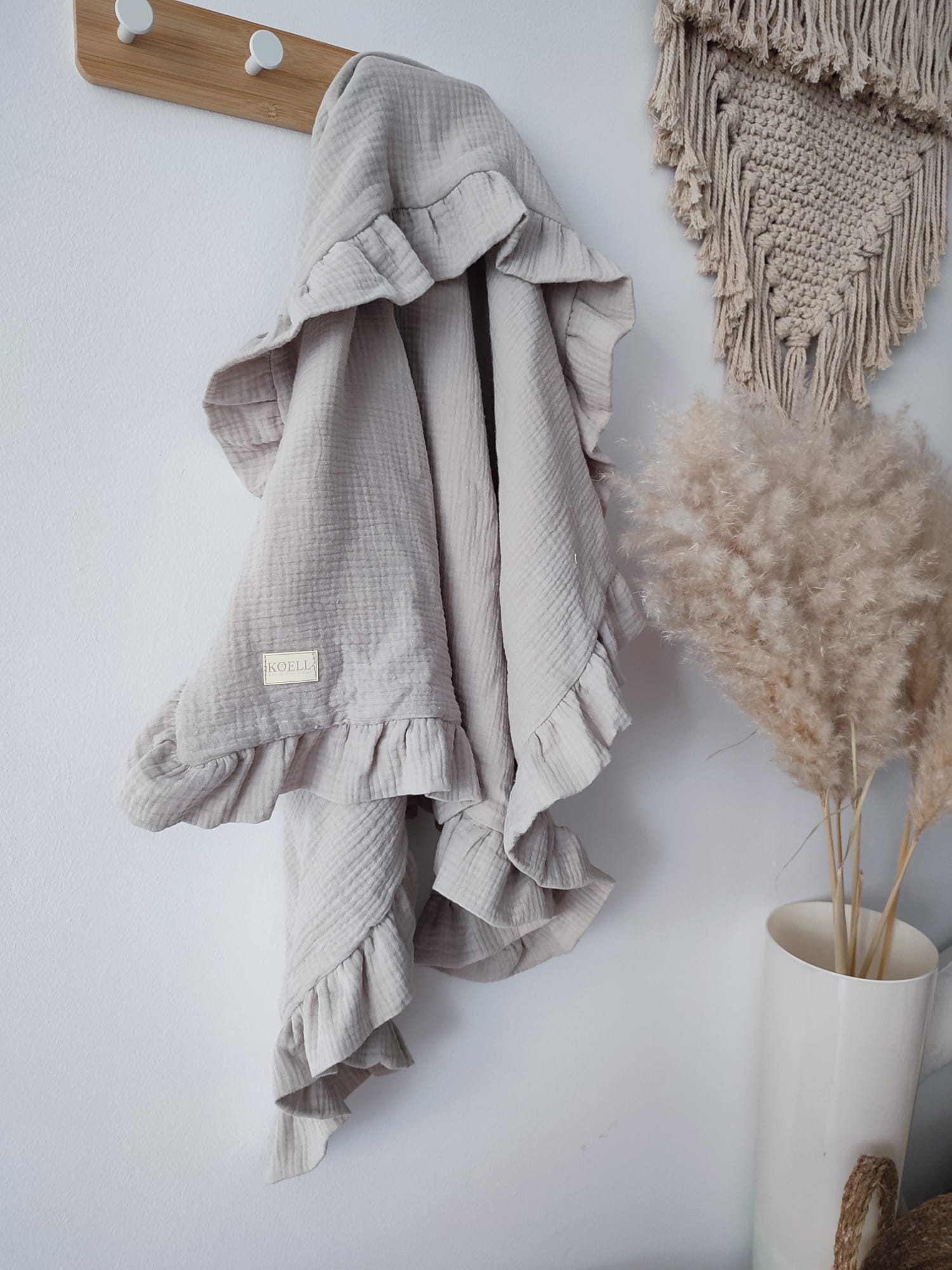 Die feine, atmungsaktive Musselin-Struktur ist ideal für die empfindliche Babyhaut und sorgt dafür, dass Ihr kleiner Liebling stets optimal gewärmt ist, ohne zu überhitzen. Unsere aufwendigen, handgearbeiteten Rüschen setzen einen einzigartigen Akzent und machen die Decke zum stilvollen Blickfang – für jedes Babyzimmer und unterwegs.