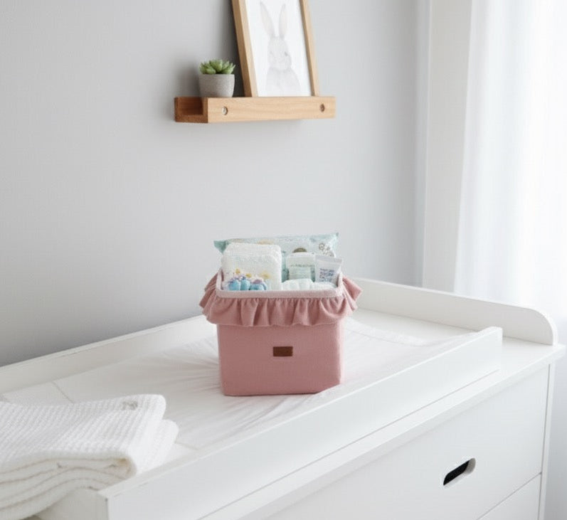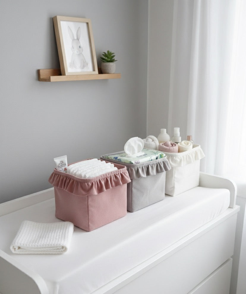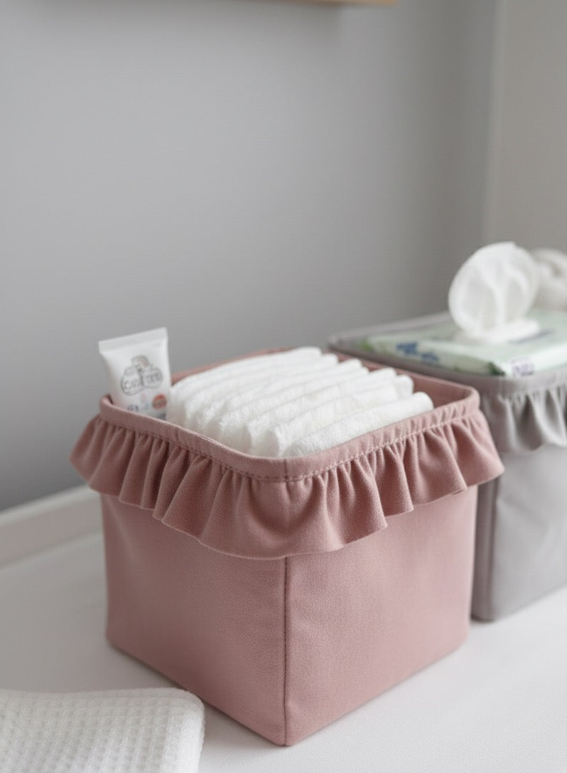 Geben Sie dem Wickeltisch oder dem Kinderzimmer mit unserem samtigen Utensilo mit Rüschen eine elegante und funktionale Note. Diese stilvolle Ergänzung erleichtert nicht nur den Alltag, sondern bereichert den Raum auch mit einem Hauch von Glamour und Raffinesse.