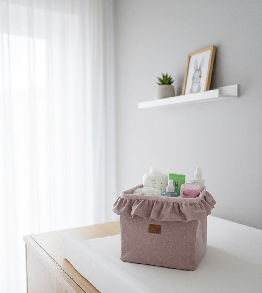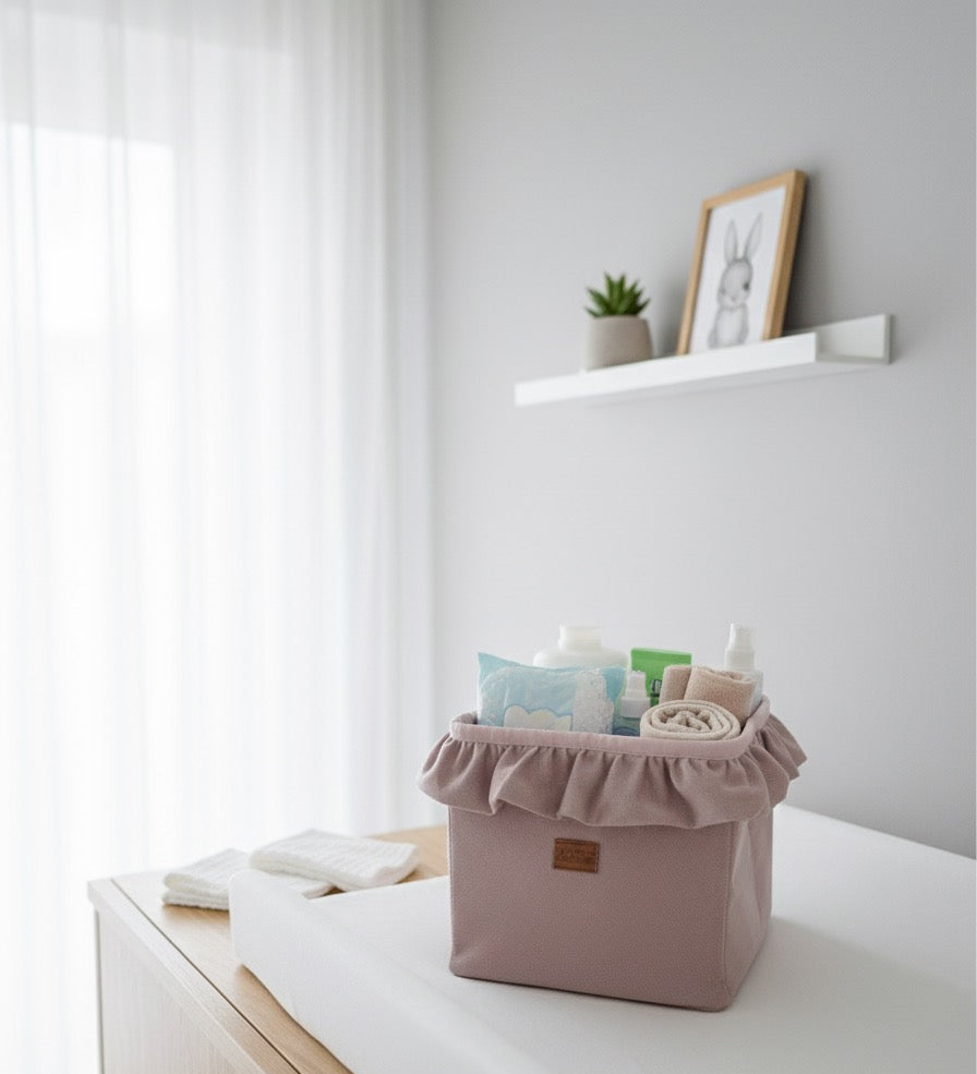 Geben Sie dem Wickeltisch oder dem Kinderzimmer mit unserem samtigen Utensilo mit Rüschen eine elegante und funktionale Note. Diese stilvolle Ergänzung erleichtert nicht nur den Alltag, sondern bereichert den Raum auch mit einem Hauch von Glamour und Raffinesse.